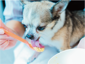 食欲の低下や自力で食べることができない時、食事の内容を見直したり飲み込みやすい形状にして食べさせるなどの食事介助を行います。また脱水を防ぐため、飲水のサポートも行います。