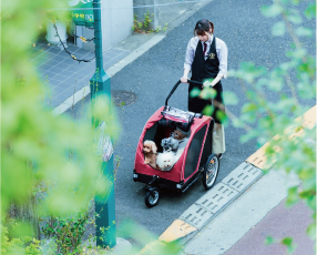 自力で歩くことや起き上がることができないご愛犬も、抱っこまたはカートを使ってお散歩をします。特に朝日を浴びることは昼夜逆転による夜鳴きを防ぐためにも有効です。